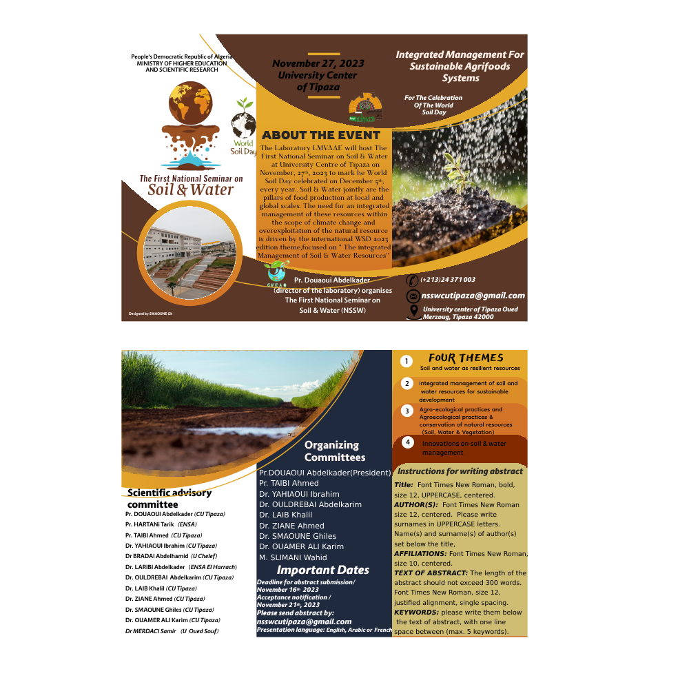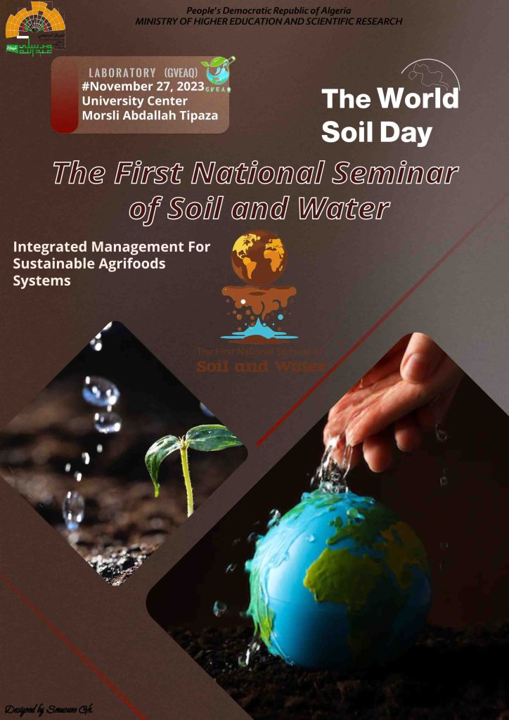 On the occasion of the celebration of World Soil Day (December 2023), the Laboratory for Management and Valorization of Agricultural and Aquatic Ecosystems is organizing the FIRST National SEMINAR ON SOIL & WATER on November 27, 2023. The event will take place at the Institute of Natural and Life Sciences, University Center of Tipaza.