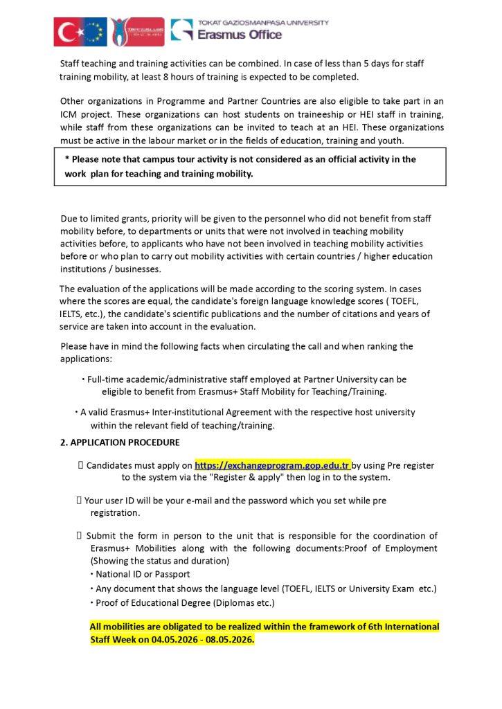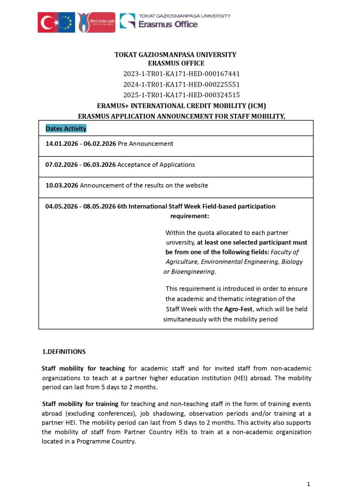 Tokat Gaziosmanpaşa University (Türkiye) has officially launched the Erasmus+ KA171 Staff Mobility Call for participation in the 6th International Staff Week, to be held from 4 to 8 May 2026.